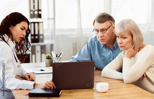 Medical Test Results. Serious mexican doctor showing digital tablet with diagnosis to mature couple, copyspace