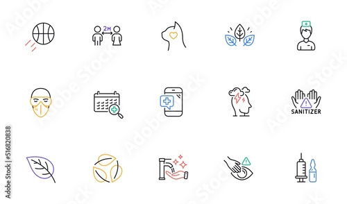 Medical vaccination, Medical mask and Organic tested line icons for website, printing. Collection of Leaves, Washing hands, Basketball icons. Clean hands, Doctor. Vector