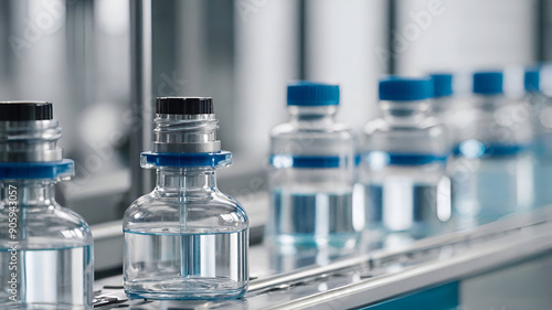 Medical vials on production line at pharmaceutical factory, pharmaceutical machine glass views.