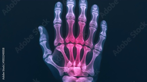 Medical X Ray Image Showing the Skeletal Structure of a Hand Affected by Arthritis Highlighting the Inflamed and Damaged Joints in Red Contrast