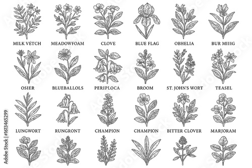 Medicinal herbs and flowers in vintage botanical engraving style, Transparent Background