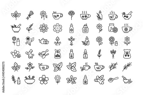 Medicinal herbs line icon set. Herbal Remedies, Tea Cups, Bottles, Flowers, Herbs, Organic, Natural Health, and more vector Illustrations .