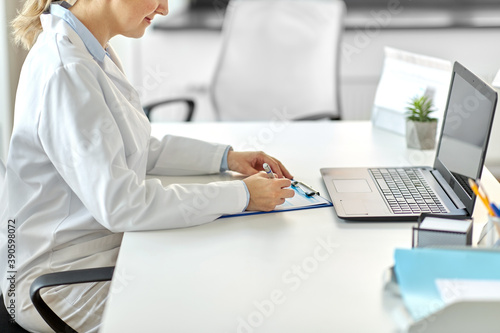 medicine, healthcare and profession concept - female doctor in white coat with laptop computer and medical report at hospital