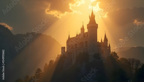 Medieval Castle on Mountain During Sunset with Dramatic Sky and Sun Rays