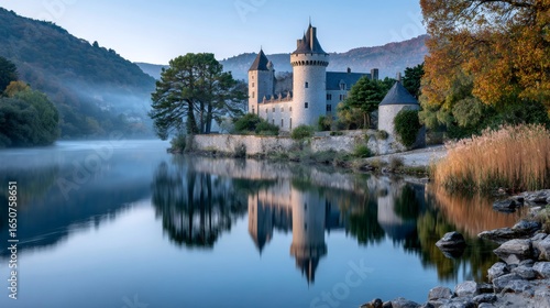 Medieval castle reflecting on serene lake during autumn sunrise