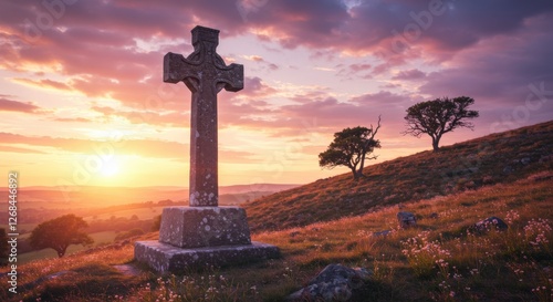 Medieval Cross at Sunset on Hilltop