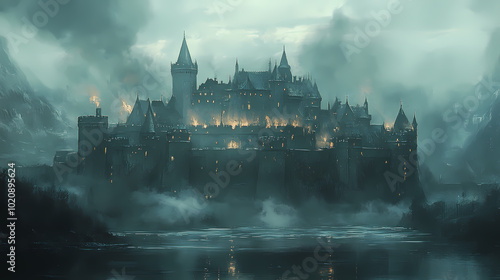 Medieval fantasy castle designed by Dark Knight. Artwork in oil and digital format.