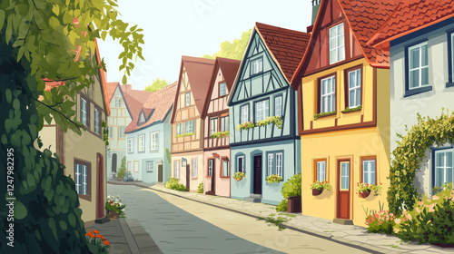 Medieval german street with half-timbered houses in white fog. Traditional european buildings in old town or village at misty weather. Vector cartoon summer landscape with fachwerk cottages and mist