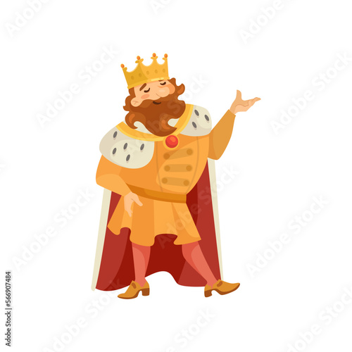 Medieval happy king cartoon character standing illustration. Funny fat man in royal costume standing on white background. Royalty, nobility, fantasy, history concept