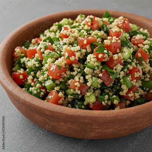 Mediterranean Tabbouleh Salad Bowl with Fresh Herbs and Vegetables close-up