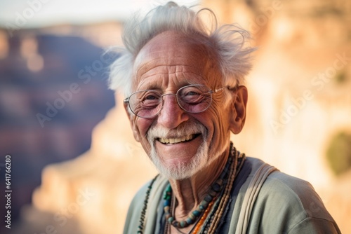 Medium shot portrait photography of a cheerful old man wearing a dramatic choker necklace at the grand canyon in arizona usa. With generative AI technology