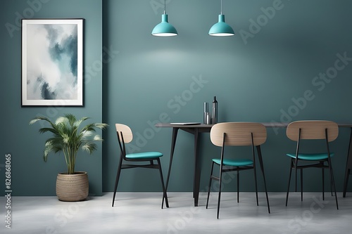 Meeting Area or Dining Room with Large Black Round Table and Teal Cyan Chairs. Empty Wall with Turquoise Azure Paint Color Accent. Modern Kitchen Interior for Home or Cafe. Art Mockup. 3D Render.