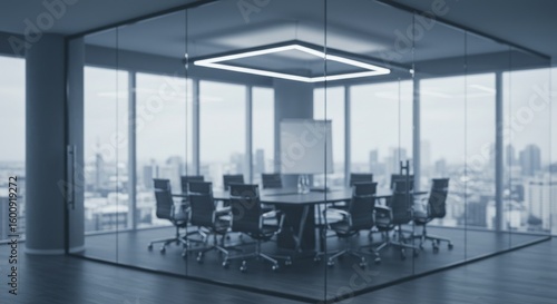 Meeting Room Blur with City View and Glass Walls in Cool Tones