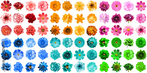 Mega pack of 72 in 1 natural and surreal blue, orange, red, green, turquoise and pink flowers isolated on white