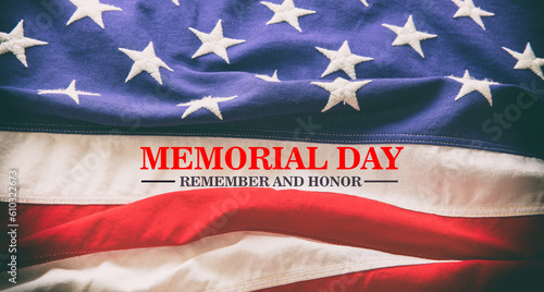 Memorial day, remember and honor text on USA flag background.