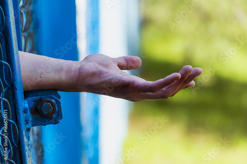 Men's arm stretched through the cage