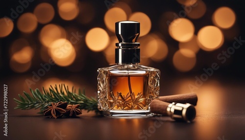 men's perfume bottle with masculine scent and decorative pieces of pine, cedar, sandalwood, cinnamon