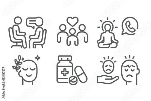 Mental Health Icons. Line style icons for mental health support: therapy, support group, mindfulness, crisis line, counselor,