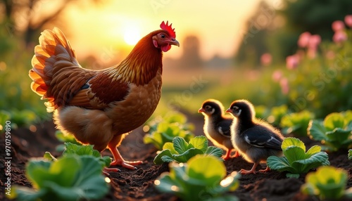 Mère poule et ses poussins trottinent dans le potager, s’approchant d’une salade verte et fraîche, parfait festin pour une balade matinale.