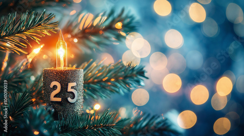Merry Christmas and Happy New Year 2025, Festive Christmas and New Year scene with fir branches, glittering ornaments, and twinkling lights. sparkling light bulbs of new beginnings