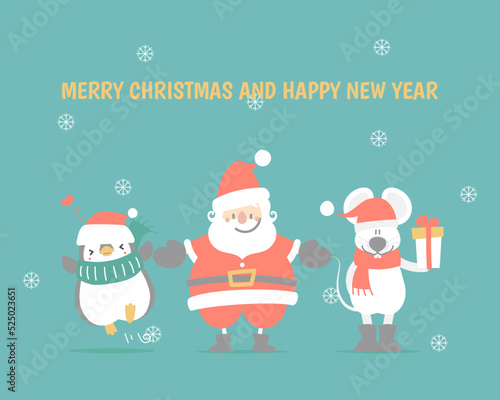 merry christmas and happy new year with cute and lovely hand drawn santa claus, mouse, penguin, snowflake, winter season green background, flat vector illustration cartoon character costume design