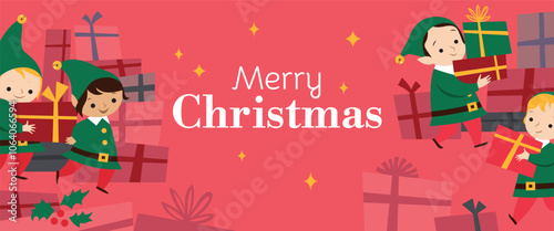 Merry Christmas banner with Santa's elves holding holiday gifts. Joyful helper sending present box. Cute cartoon character wear green costumes. Horizontal background. Vector greeting card illustration