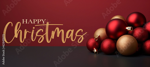 Merry Christmas, festive celebration holiday holidays greeting card with text - Gold and red ornaments (christmas baubles) on table with red background (Generative Ai)