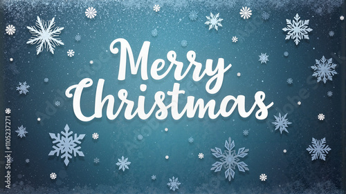 "Merry Christmas" in white cursive text with snowflakes on a frosty blue background