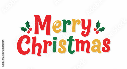 Merry Christmas lettering in festive colors and holly berries against pure white background. Merry Christmas message is ideal for holiday greetings, announcements, or social media posts.