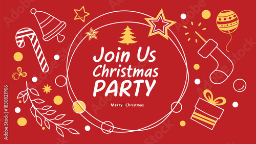 Merry christmas party glass ball and gift box for flyer brochure design on red background invitation theme concept. A festive red Christmas vector poster with a glowing bokeh template. Happy holiday