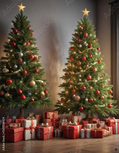 Merry Christmas scene with decorated tree and gifts, presents, decorations, ornaments