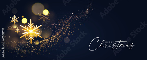 Merry Christmas shining celeration with motion light and gold snowflakes.