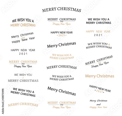 Merry Christmas. Text design. Happy New Year 2021. We wish you a Merry Christmas. Typography collection. Logo, emblem. Text for banner or poster and greeting card. Vector illustration.