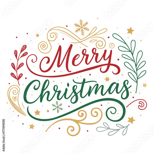 Merry Christmas Typography Vector with Red Green and Gold Swirls, Festive Holiday Lettering Design