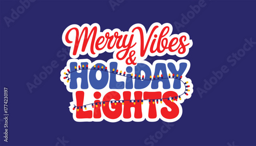 Merry vibes and holiday lights text with festive christmas lights