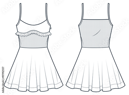 Mesh mini Dress technical fashion illustration. Strap Dress fashion flat technical drawing template, transparent, front and back view, white, women Dress CAD mockup.