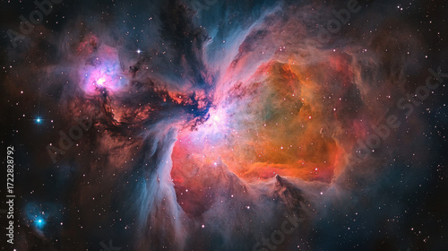 mesmerizing view of a colorful nebula in outer space, featuring vibrant shades of pink, blue