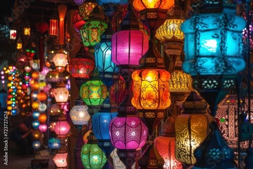 mesmerizing view of various colorful and intricately designed lanterns hanging at a night