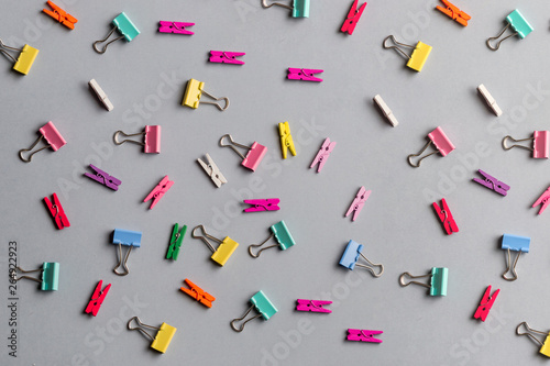 messy table with colorful pins and clothes pegs. top view photo. seamless pattern of small items