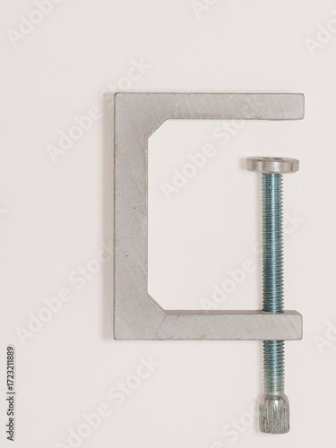 Metal C clamp isolated on white background with overhead view