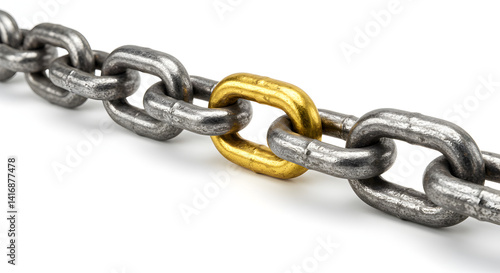 Metal Chain with One Gold Link on White Background Symbolizing Strength and Connection