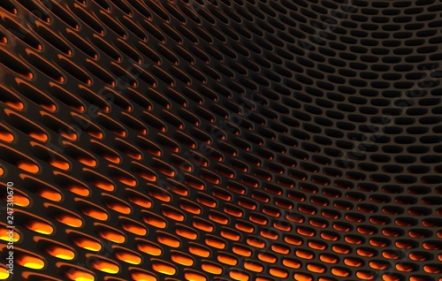Metal mesh grild. Abstract 3d rendering background in high resolution. 3d render of black carbon grid with orange light.