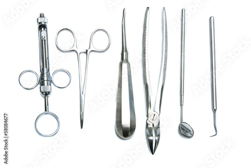 Metallic dentist tools close up in a dentist clinic.