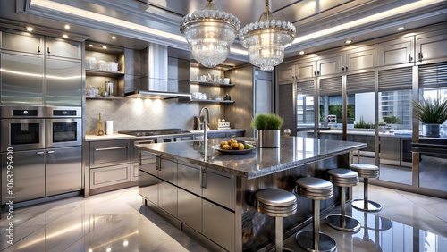 Metallic Kitchen with Reflective Cabinets and Crystal Chandelier. Perfect for: Upscale dining, festive gatherings, luxury homes