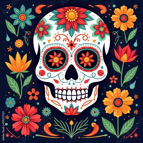 Mexican Artwork Featuring Colorful Day of the Dead Icons and Symbols.