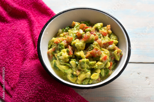 Mexican guacamole with tomato on white background