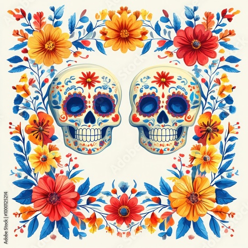 Mexican Halloween: Day of the Dead Skulls & Traditions - Festive Banner, Frame, and Isolated Sugar Skull Tattoo on Dia de los Muertos Background