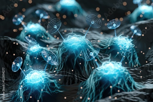 Microscopic view of glowing cells with intricate network structures, possibly depicting neural or cellular activity.