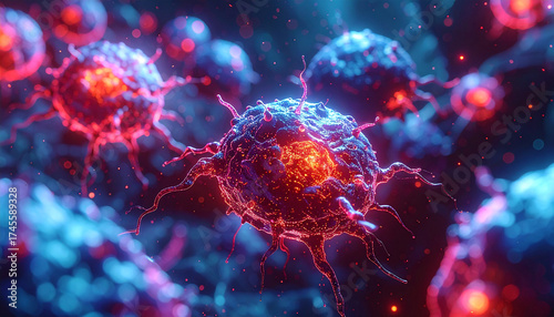 Microscopic World of Cells: Delving into the intricate beauty of cell structures, revealing vibrant colors and dynamic forms of a cellular landscape.