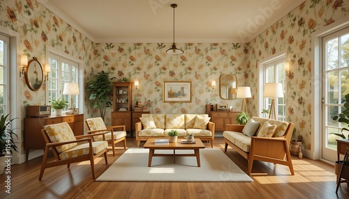 Mid Century Modern Living Room Floral Wallpaper Wooden Furniture